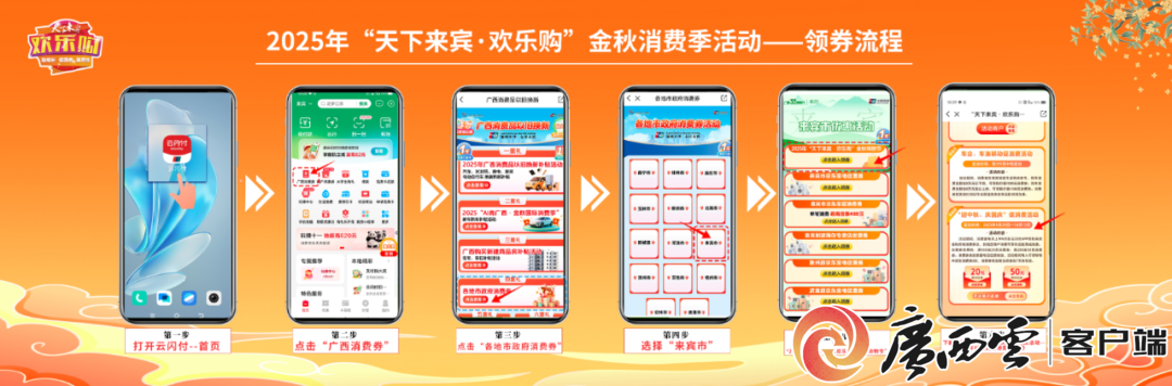本次活动还同步发放金秋满减消费券,每天上午9点市民可在云闪付App开抢。消费券设“满100减20”“满200减50”两种面额,覆盖商超、百货、餐饮等多个领域,每人每种面额可领取2张。市民可通过云闪付首页“广西消费券”—“各市政府消费券”—“来宾市”—2025年天下来宾欢乐购“金秋购物节”—“迎中秋、庆国庆”促消费活动的路径领取。