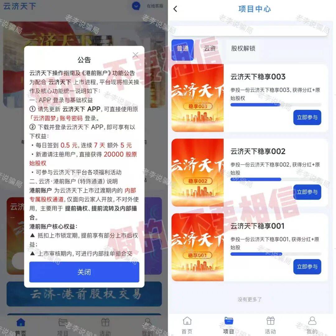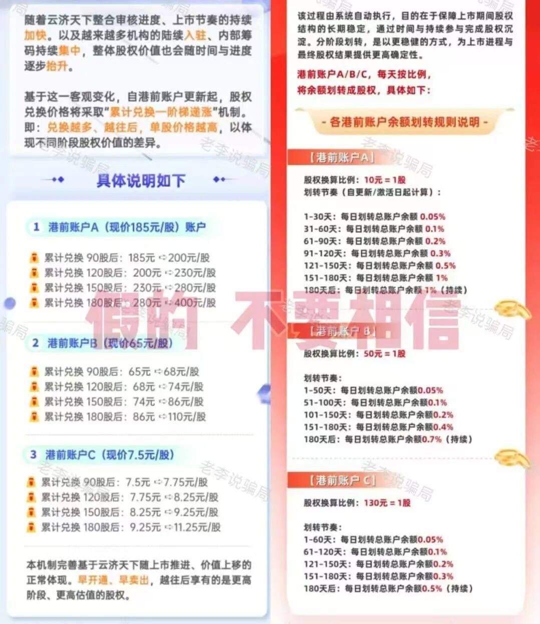 并声称账户激活后,会将两个项目的历史余额依据港前账户等级,按既定比例、分阶段划转为“上市股权”。