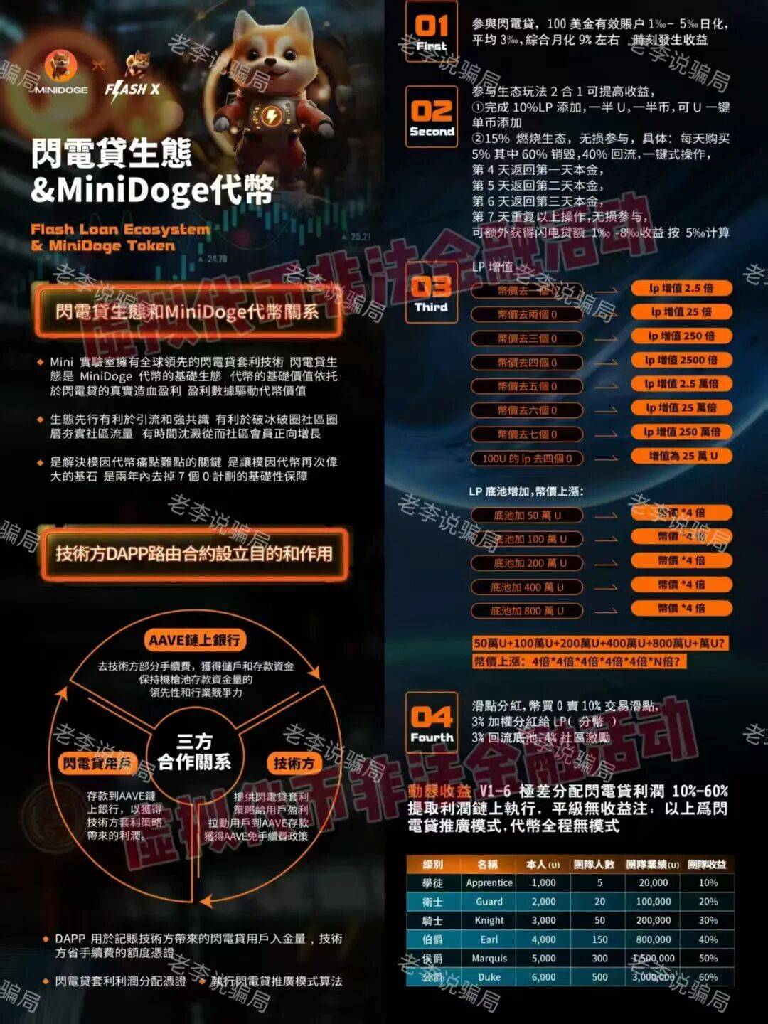 以“MiniDoge代币增值”为买点的项目,宣称投入100美金即可享受日化3%的收益,拉团队还能获得60%的极差利润,代币去零后LP价值将增值250万倍。