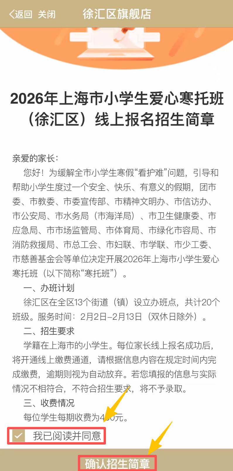 第二步:依次查看《招生简章》《告家长书》,勾选“我已阅读并同意”后点击“确定”。办班时间、收费标准、注意事项等重要信息都在里面,请各位家长认真阅读。