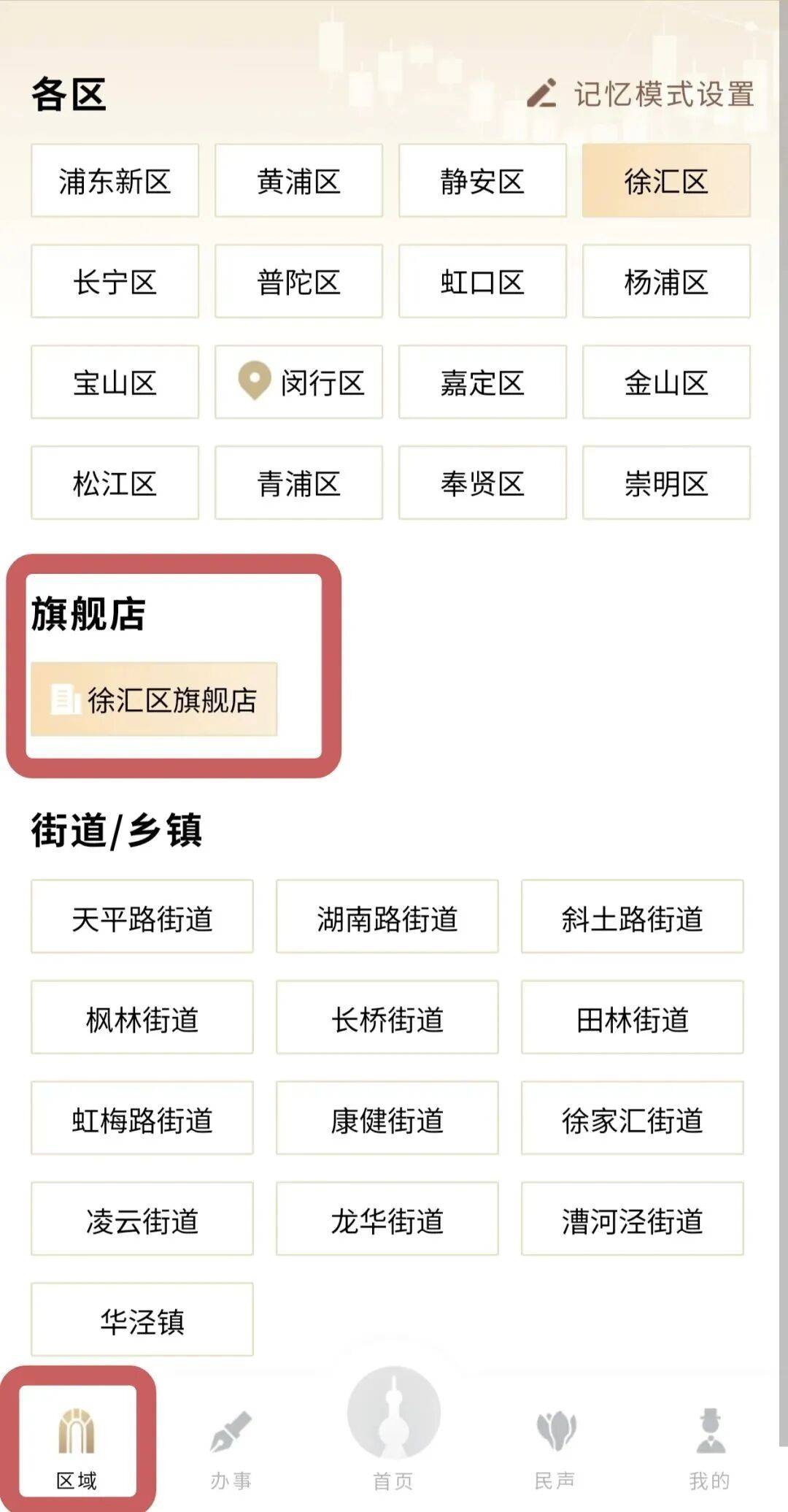打开“随申办市民云”APP,切换至“区域”模块,可以找到所有区的旗舰店入口↓