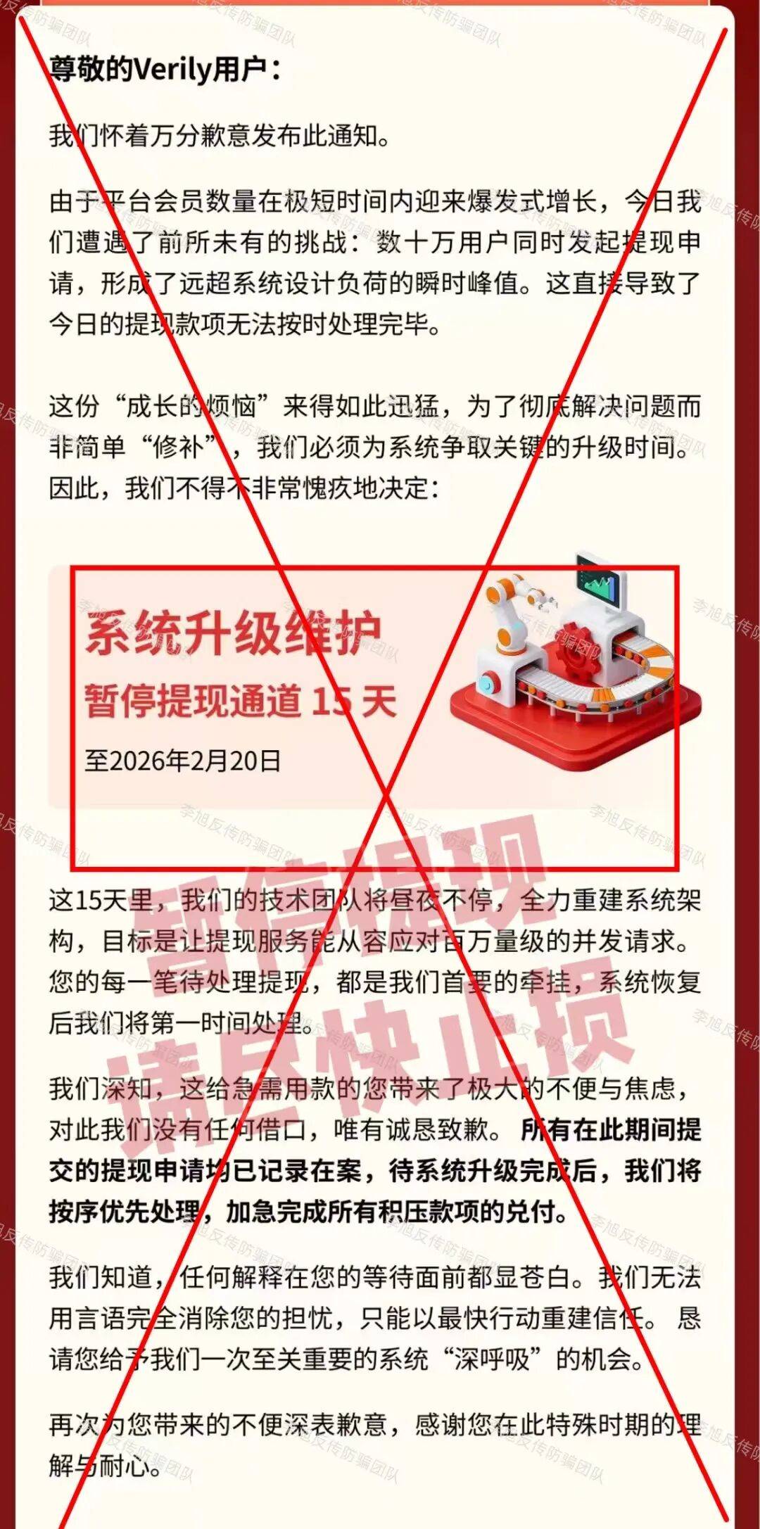 果不其然,该项目突然发布通知,以“系统升级维护“为名暂停提现15天。公告声称恢复日期为2月20日,但届时正值春节假期当中,项目方很可能会以各种借口继续不断拖延。参与者们还是醒醒吧。