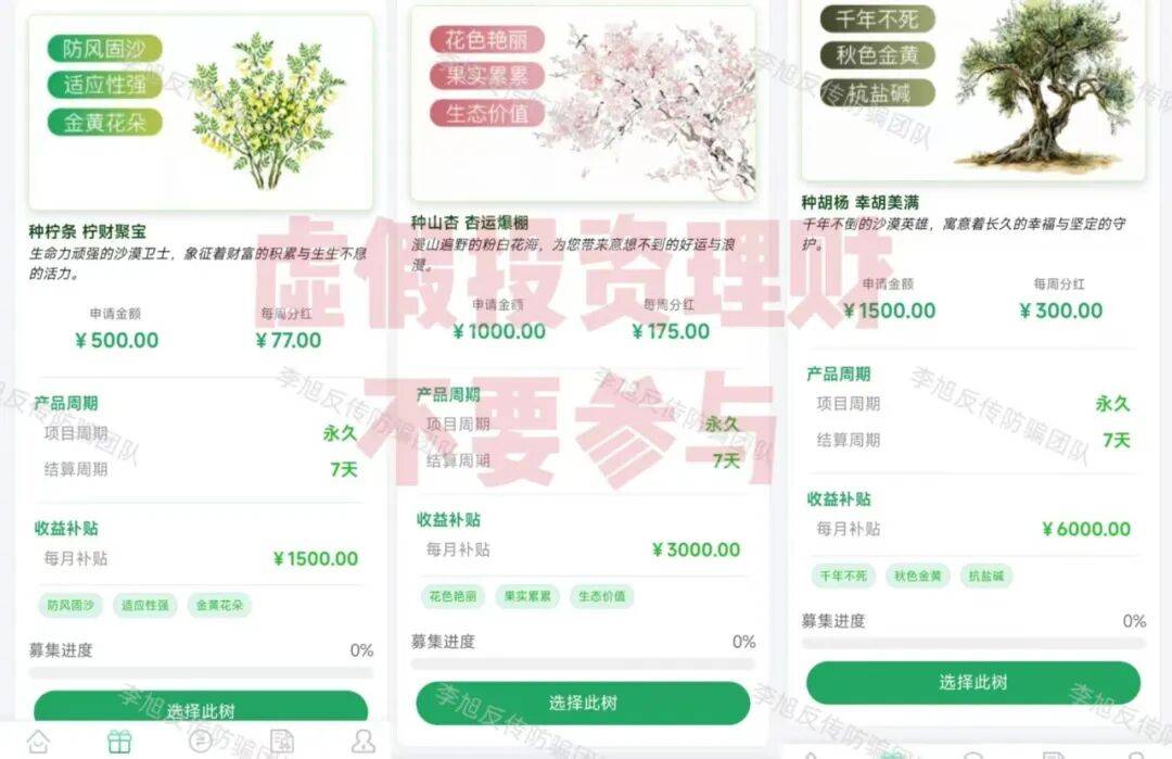 一系列操作在短时间内大量吸纳参与者,在博取其信任后,“三北工程”APP上线,将各种树木包装成理财产品,利用高额收益忽悠用户认购。