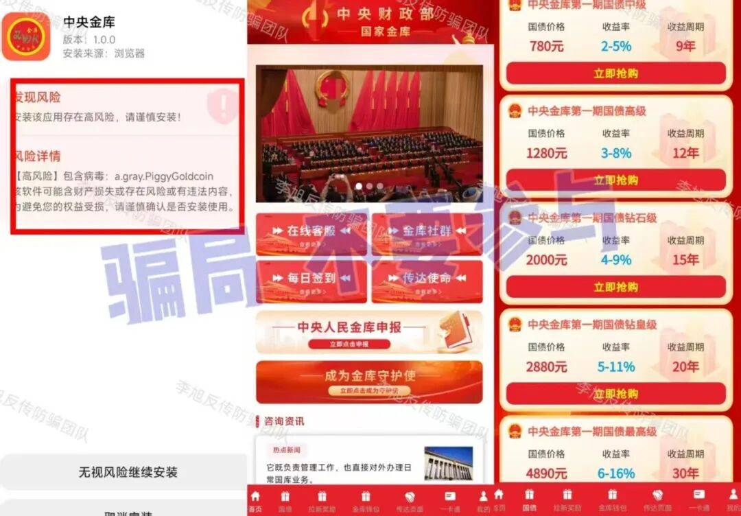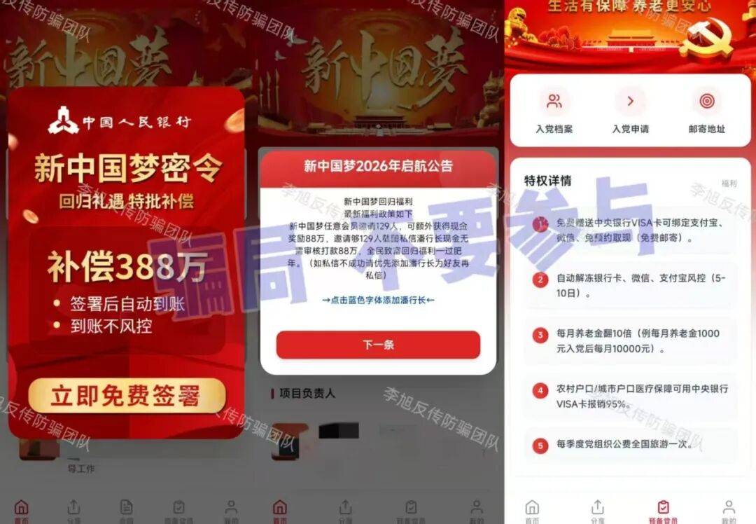 冒充国家机关,声称注册即送“50万国债、500克黄金、200万国家红利”等,邀请新人还有额外奖励。