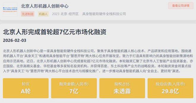 该消息仅过去5天,北京人形通过官方公众号宣布完成首轮超7亿元市场化融资,北京市人工智能产业投资基金、亦庄国投等机构,以及百度、东土科技等产业方参与此次投资,注册资本也从4.6亿元增至约6.01亿元。