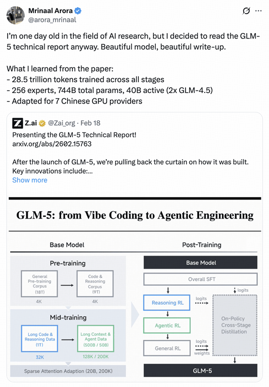 4. 全栈国产芯片适配: GLM-5完成了与华为昇腾、摩尔线程等七大国产算力平台的全栈深度优化,单节点性能媲美双GPU集群,长序列处理成本降低50%,实现了旗舰级大模型在国产算力生态上的高效落地。这一突破,不仅打破了海外算力生态对大模型发展的垄断,更让中国企业能够基于完全自主可控的技术栈,构建属于自己的AI智能体应用,为中国AI产业的长期安全发展筑牢了根基。