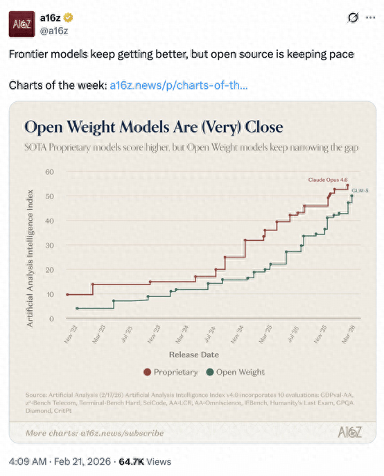 硅谷顶级风投机构a16z近期发布的行业报告指出,开源大模型与顶级闭源模型之间的能力差距,正在以肉眼可见的速度快速收窄,而报告中被拿来与闭源天花板Claude Opus 4.6正面对标的,正是来自智谱的开源模型GLM-5。
