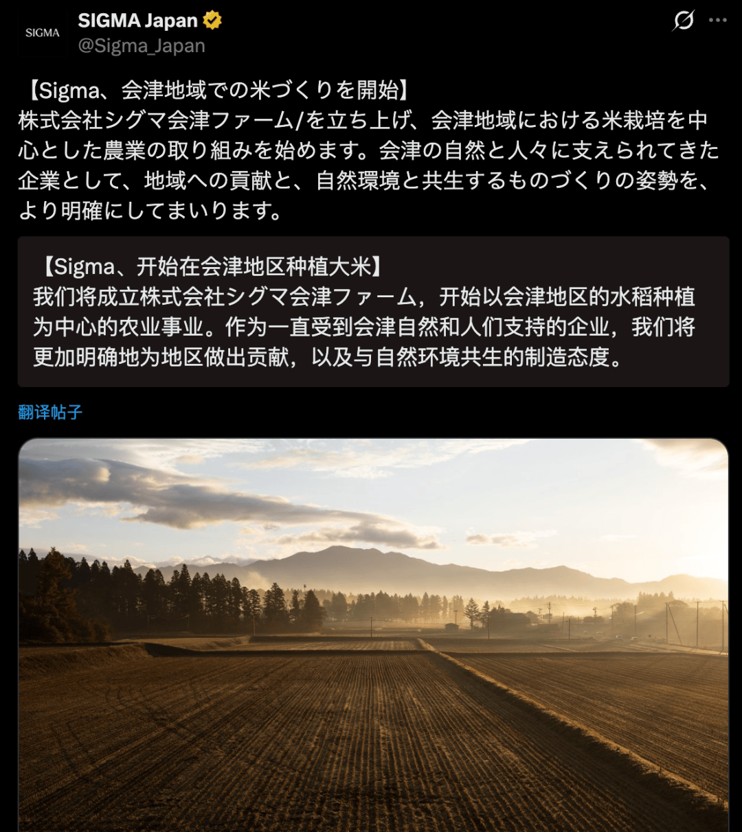 昨日,日本光学设备制造商适马正式宣布,计划于 2026 年 4 月 1 日成立子公司「适马会津农场(Sigma Aizu Farm)」,在会津地区启动以水稻栽培为核心的农业项目。