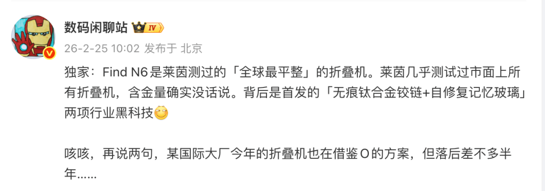 其指出,原因是 OPPO Find N6 首发的「无痕钛合金铰链」+「自修复记忆玻璃」两项行业黑科技。