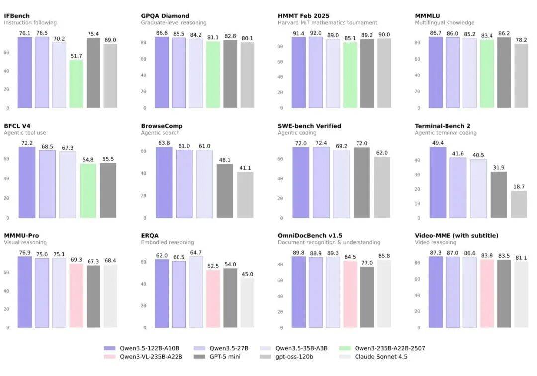 而 Qwen3.5-122B-A10B 与 27B 版本进一步缩小了中等规模模型与前沿模型的差距,尤其在复杂代理场景中表现优异。