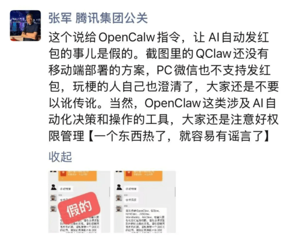 就在这场狂欢愈演愈烈之际,一则“OpenClaw可自动发微信红包”的传言刷屏网络,逼得腾讯公关负责人张军亲自下场辟谣:“该消息系虚假传言。”他同时提醒,“OpenClaw这类涉及AI自动化决策和操作的工具,大家还是注意好权限管理。”