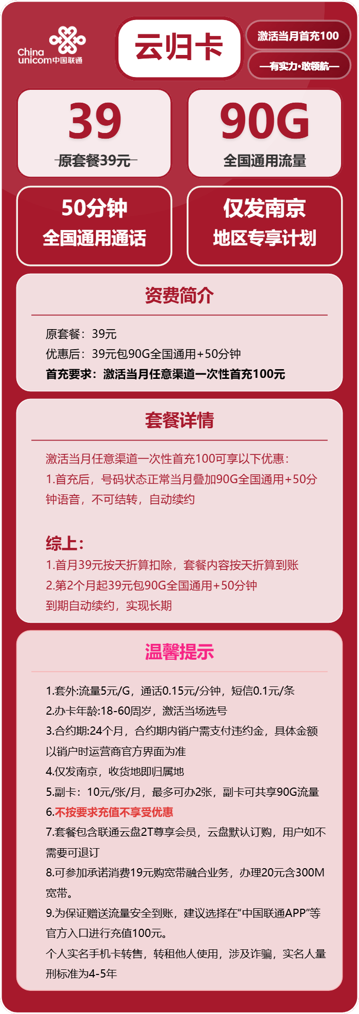 39元档位是2026年南京联通套餐的核心爆款,其中联通云归卡是小韩聊卡最推荐的南京联通39元流量卡,也是南京联通本地流量卡的标杆,实测体验直接拉满。这款卡专为南京用户打造,归属地仅发南京,收货地即归属地,39元/月享90G全国通用不限速流量+50分钟全国通用通线元即可解锁,到期自动续约实现长期有效。最核心的是本地福利:可办2张副卡(10元/张/月),副卡共享90G流量;加20元享300M宽带,流量+宽带融合;自带2T联通云盘尊享会员;激活当场选号,能选心仪的南京本地号码。在南京主城、溧水、高淳等区域实测,5G稳定在300M/s左右,刷4K视频、办公开热点都超流畅,高峰期无卡顿。