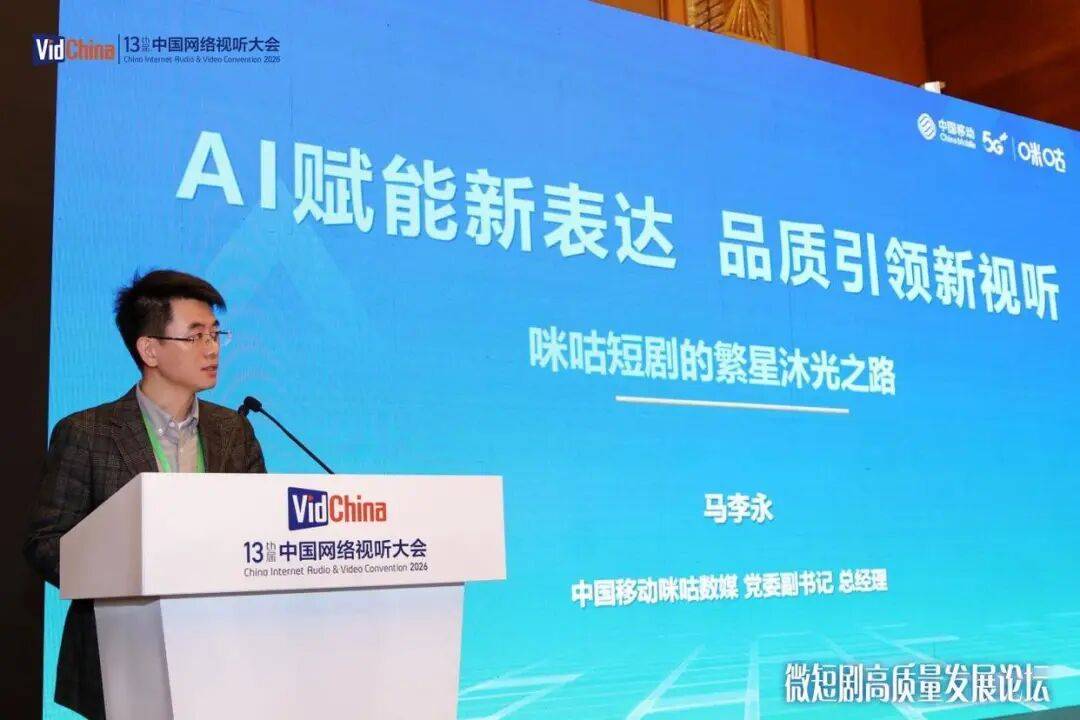 2026 年中国网络视听大会盛大启幕,在4月15日微短剧高质量发展论坛上,中国移动咪咕数媒党委副书记、总经理马李永发表《AI 赋能新表达,品质引领新视听——咪咕短剧的繁星沐光之路》主旨演讲,重磅发布“繁星沐光”五大战略计划,以开放 IP、AI 工具、平台激励、会员升级、多元发行打造全链路赋能体系,为微短剧行业注入新动能。
