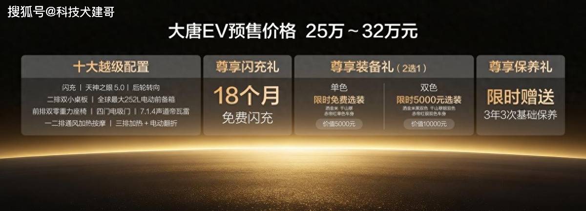 此次大唐EV共推出800KM后驱、950KM后驱、850KM四驱三种续航,预售价25万元~32万元。预售期间下订,可享18个月免费闪充权益、三款单色车漆0元选装、双拼色限时半价5000元及3年3次免费保养等多重尊享礼遇。