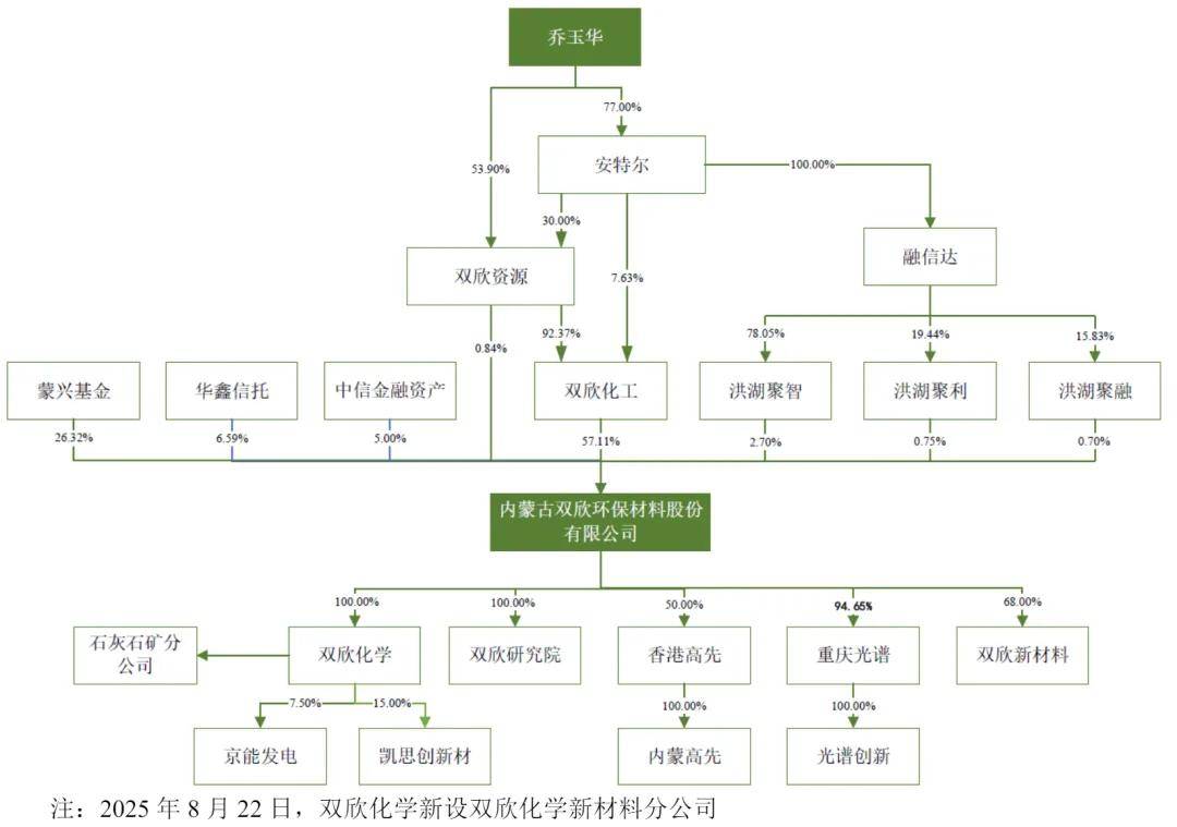 IPO前,双欣化工持有公司49,116.70万股股份,占公司总股本的57.11%,系公司控股股东。乔玉华通过双欣资源、安特尔间接控制公司股东会共计62.10%的表决权,系公司实际控制人。