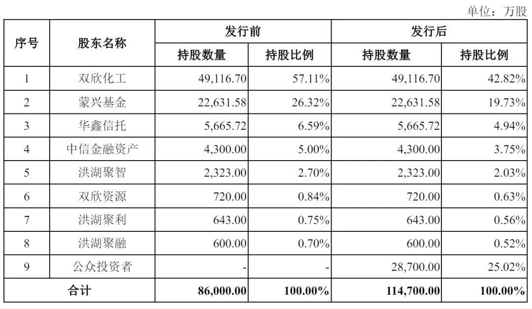 IPO后,双欣化工持股为42.82%,蒙兴基金持股为19.73%,华鑫信托持股为4.94%,中信金融资产持股为3.75%,洪湖聚智持股为2.03%,双欣资源持股为0.63%,洪湖聚利持股为0.56%,洪湖聚融持股为0.52%。