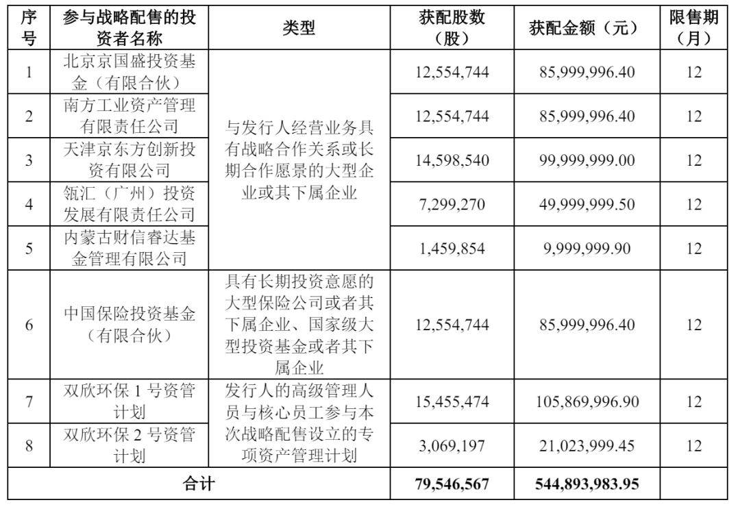双欣环保战略投资者分别为北京京国盛投资基金(有限合伙)、南方工业资产管理有限责任公司、天津京东方创新投资有限公司、瓴汇(广州)投资发展有限责任公司、内蒙古财信睿达基金管理有限公司、中国保险投资基金(有限合伙)、双欣环保 1 号资管计划、双欣环保 2 号资管计划,一共认购5.45亿元。