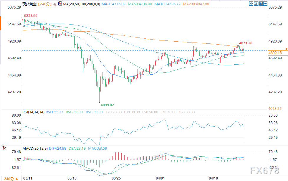 4小时级别来看,现货黄金维持高位区间震荡,整体偏多但上行动能不足。金价多次试探200周期简单移动平均线美元,均未能有效站稳,构成近期强阻力。短期支撑位于4800美元整数关口,更强支撑在100周期均线美元附近。