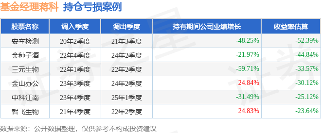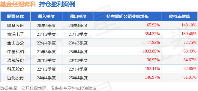 重仓股调仓示例详解: 1、隆基股份(601012)翻倍案例: 蒋科管理的广发趋势动力混合A基金在20年2季度买入隆基股份,在持有2个季度后在20年4季度卖出。持有期间的估算收益率为148.1%,持有期间隆基股份在2019年到2020年的年报营业总收入增幅达65.92%。 2、金山办公(688111)调仓案例: 蒋科管理的广发趋势动力混合A基金在22年4季度买入金山办公,在持有2个季度后在23年2季度卖出。持有期间的估算收益率为72.75%,持有期间金山办公在2022年到2023年的年报归属净利润增幅达17.92%。 3、安车检测(300572)折戟案例: 蒋科管理的广发趋势动力混合A基金在20年2季度买入安车检测,在持有1年又1个季度后在21年3季度卖出。持有期间的估算收益率为-52.39%,持有期间安车检测在2020年到2021年的年报营业总收入降幅为48.25%。