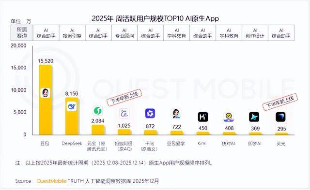 Quest Mobile榜单显示,在最新统计周期内(2025年12月8日至12月14日),周活跃用户规模Top10的AI App中,有6个通用AI,4个垂类场景的专业AI,形成了通用和垂类AI分庭抗礼的格局。