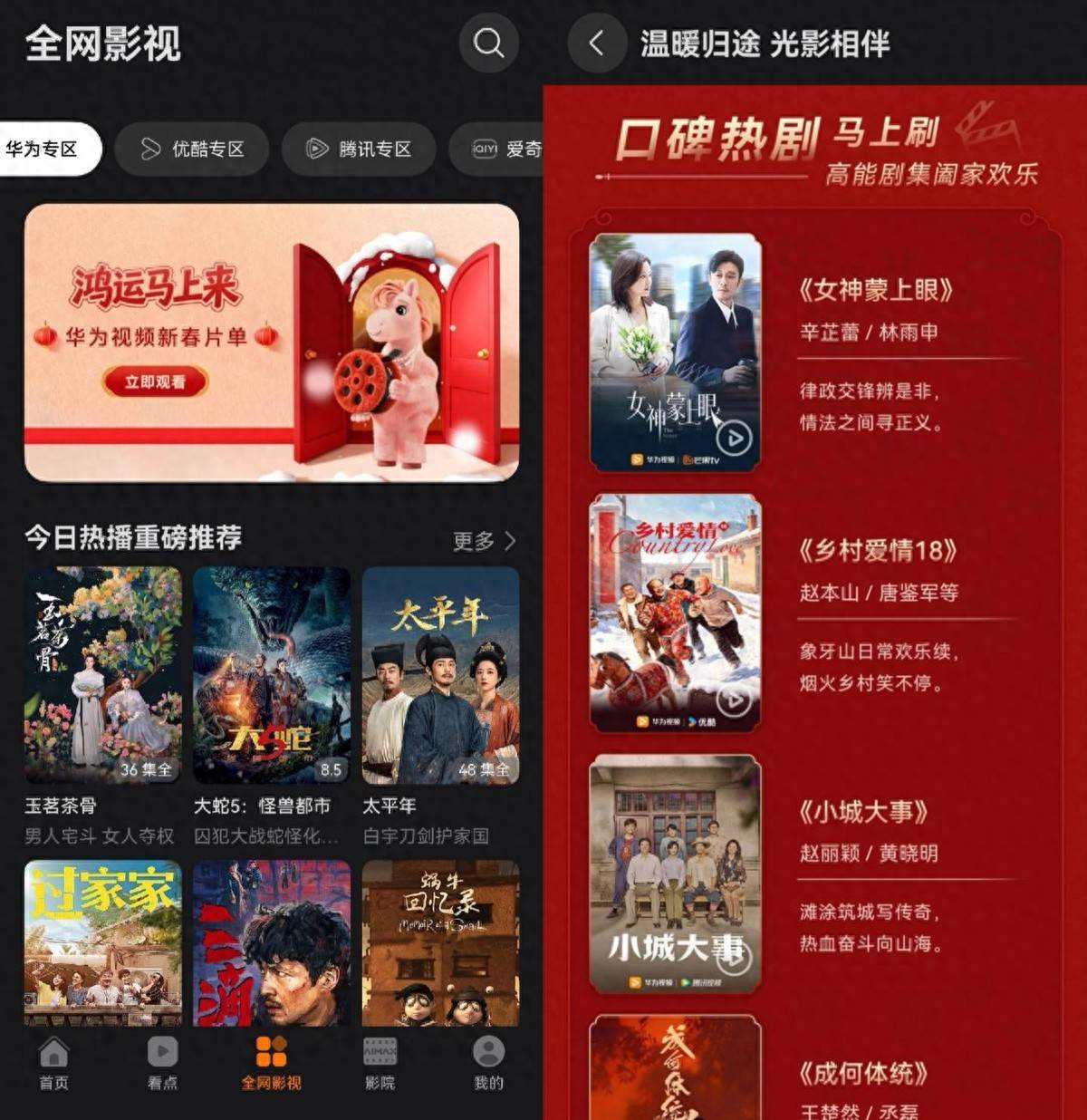 最近华为视频新上的“全网影视”Tab简直是追剧党的福音。它把华为影视(芒果TV)、优酷、腾讯视频、爱奇艺四大平台的热门内容聚合在一起,想看的剧一搜就有,不用来回切App就能看到全网的热播剧。