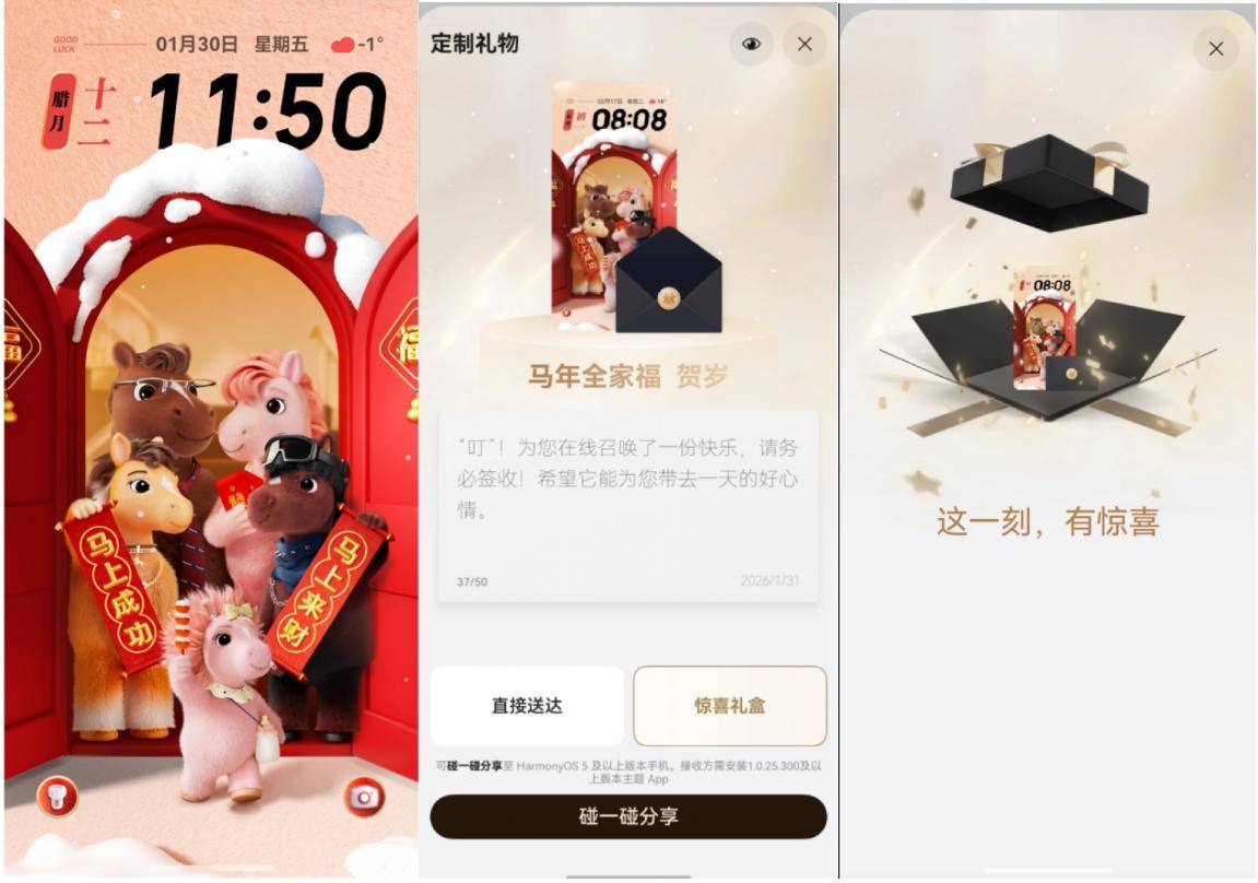 我还给家人好友们准备了特别的新年礼物为大家好运加“马”,趁着华为主题新春活动,我速速拿下主题和表盘年卡会员。还解锁了碰一碰新玩法!我在多款新年氛围感主题里挑选出《马年全家福 贺岁》主题,在主题详情页右上角的礼物图标,点击“购买并赠送”,可以跟同样升级HarmonyOS 6的手机“碰一碰”赠送,这份心意就秒送到手里并即刻给手机换上,仪式感简直拉满。